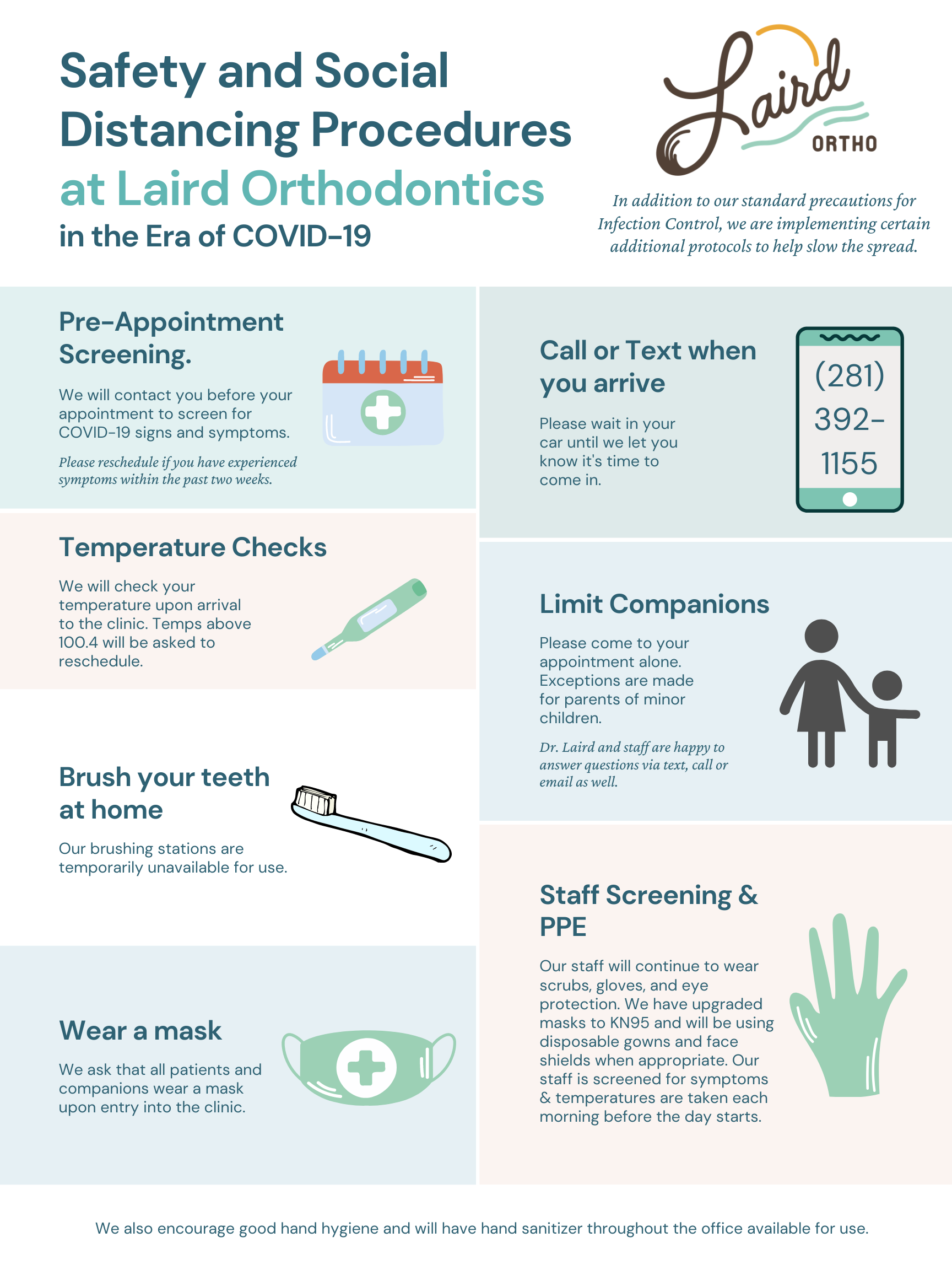 Patient well-being has always been our highest priority at Laird Orthodontics. Our orthodontist and team are dedicated to making sure that every visit to our office is not just convenient, comfortable and effective but also as safe as possible. We strictly adhere to federal state and local safety guidelines and have taken the extra steps needed to prevent the spread of COVID-19. If you would like to learn more about our infection control measures in Katy, Texas, or just want to plan a visit with Dr. Aaron Laird, call our office at 281-392-1155 today.